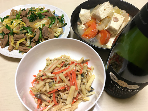 本日のメニューは、上段左からモツ炒め、煮込み豆腐、下段が塩サバと大根の味噌なます、です。
