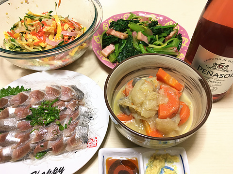 本日のメニューは、上段左からかんぴょう入り中華サラダ、ベーコンとほうれん草のバターソテー、下段左からイワシの刺身、野菜の煮付け、です。