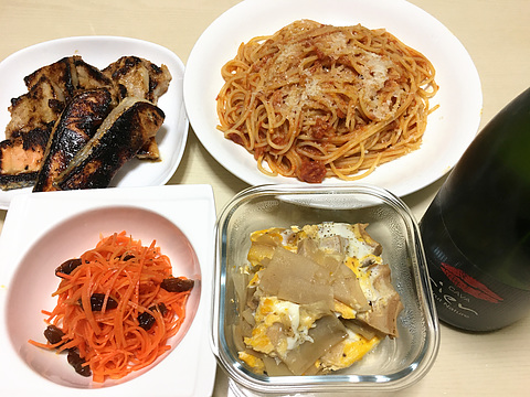 豚肉と鮭の酒粕味噌漬け焼き、他 本日のメニューは、上段左から豚肉と鮭の酒粕味噌漬け焼き、トマトソースパスタ、下段左からにんじんのラペ、車麩とかんぴょうの玉子とじ、です。 酒粕味噌漬け焼きはちょっと焦げ色が強いですが、味はとってもよかったです。