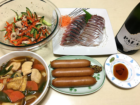みそ煮込みうどん、他 本日のメニューは、上段左から鶏皮ときゅうりとにんじんのゆかり和え、イナダの刺身、下段左からみそ煮込みうどん、チーズ入りソーセージ、です。 味噌煮込みうどんは、ばいきんまんさんのところからいただいた宮きしめんの袋麺です。
