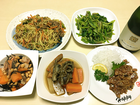 本日のメニューは、上段左からひき肉ともやしのあんかけ風焼きそば、ほうれん草のガーリックバター醤油炒め、下段左から洋風ひじき豆、ゼンマイの煮物、アジのたたき、です。