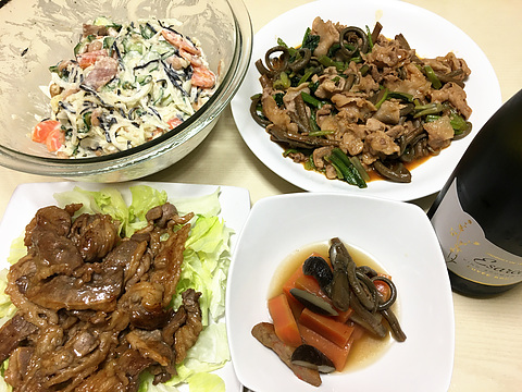 本日のメニューは、上段左から大豆とひじき入りポテトサラダ、豚肉とゼンマイのコチュジャン炒め、下段左から牛カルビ焼肉、ゼンマイとにんじんの煮物、です。