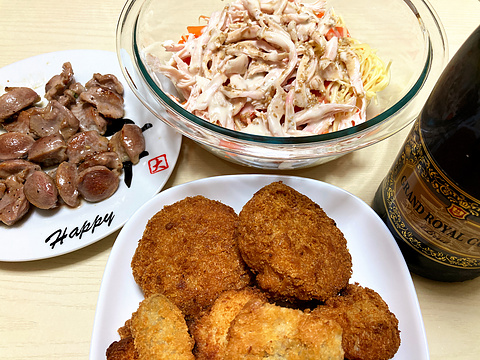 本日のメニューは、上段左から砂肝の塩焼き、サラダチキンとにんじんとサラスパのサラダ、下段が揚げ物各種、です。