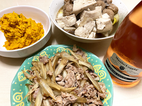 本日のメニューは、上段左からカボチャのハニーマスタードサラダ、肉団子と豆腐と舞茸の中華煮、下段が豚肉とごぼうのきんぴら、です。