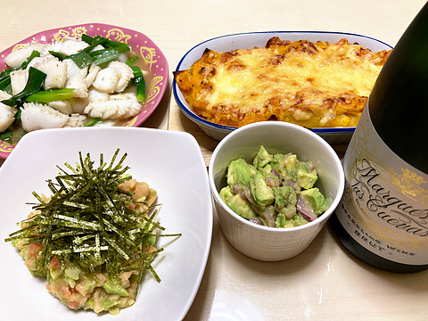 本日のメニューは、上段左からイカとネギの塩炒め、カボチャ餃子グラタン、下段左からサーモンネギとろアボカド、アボカドの塩辛和え、です。