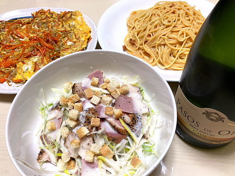 本日のメニューは、上段左からにんじんとジャコの玉子焼き、伊勢エビのトマトクリームパスタ、下段が鴨のパストラミとネギのシーザードレッシング和え、です。