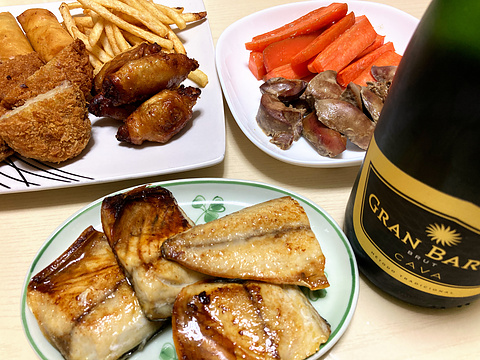 本日のメニューは、上段左から揚げ物各種、鶏レバーの塩麹漬け焼き、下段が塩サバのバターソテー、です。
