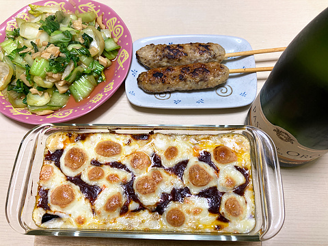本日のメニューは、上段左から青梗菜と山東菜の穂先めんま炒め、牛タン入りつくね(既製品を焼いたもの)、下段がナスのグラタン、です。