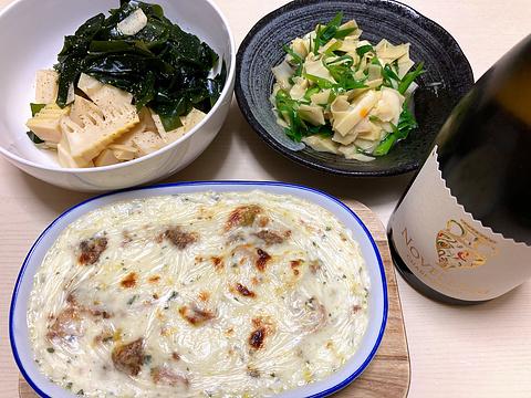 本日のメニューは、上段左から若竹煮、たけのことネギの中華炒め、下段がカボチャコロッケグラタン、です。