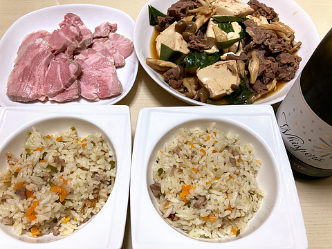 本日のメニューは、上段左から豚肩ロースの低温調理、肉豆腐、下段がバターピラフ、です。