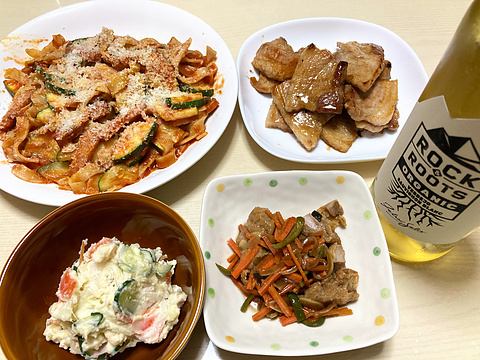 本日のメニューは、上段左からベーコンとズッキーニのトマトソースパスタ、豚バラ肉の甘酢しょう油炒め、下段左からポテトサラダ、鶏から揚げの南蛮漬け、です。