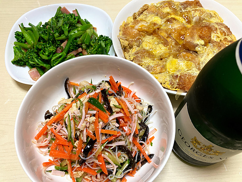 本日のメニューは、上段左からスティックセニョールのガーリックベーコン炒め、カツ煮、下段が春雨の中華サラダ、です。