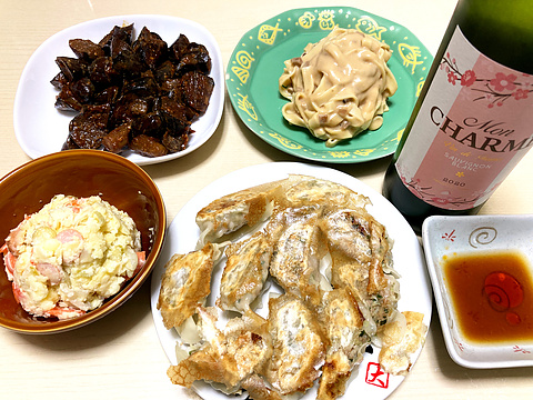 本日のメニューは、上段左からナスの油みそ、きのこクリームパスタ、下段左からポテトサラダ、自家製焼き餃子、です。