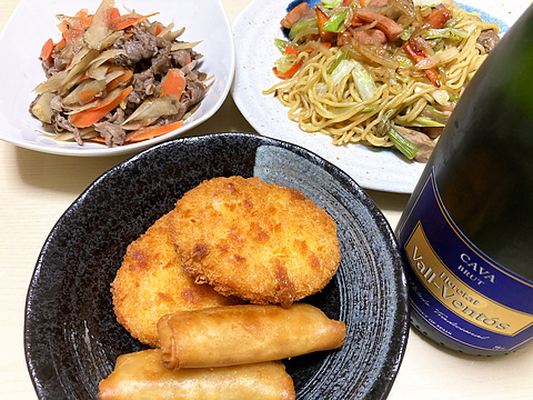 本日のメニューは、上段左から牛肉とごぼうの時雨煮、塩焼きそば、下段がコロッケと春巻き(市販品を揚げたもの)、です。