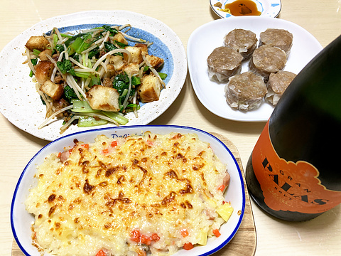 本日のメニューは、上段左からもやし炒め、シュウマイ、下段がクラムチャウダードリア、です。
