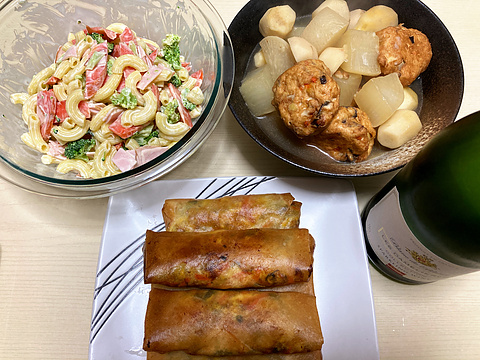 本日のメニューは、上段左からマカロニサラダ、がんもと里芋と大根の煮物、下段がにんじんしりしりの春巻き、です。