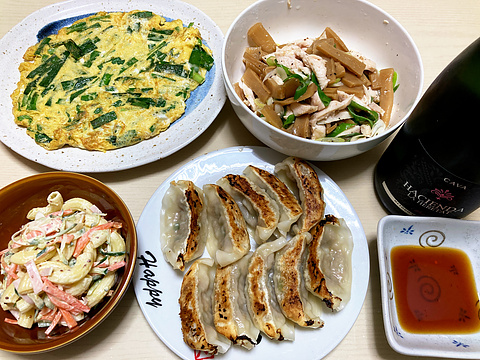 本日のメニューは、上段左からニラ玉、自家製サラダチキンのめんま和え、下段左からマカロニサラダ、焼き餃子(冷凍品を焼いたもの)、です。