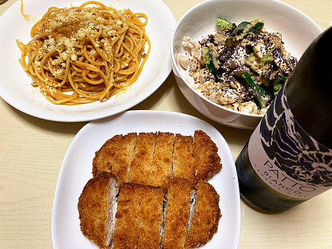 本日のメニューは、上段左から生クリームボロネーゼパスタ、きゅうりと鶏ササミの梅ごま和え、下段がトンカツ(冷凍品を揚げたもの)、です。