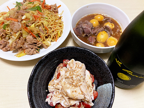 本日のメニューは、上段左からソース焼きそば、砂肝とキンカンの煮付け、下段が自家製サラダチキンとトマトのサラダ、です。
