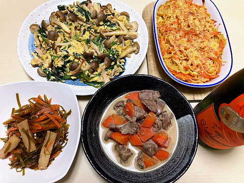 本日のメニューは、上段左からほうれん草としめじの玉子炒め、焼きそばとにんじんのドリア風、下段左から昆布煮、鶏レバーとにんじんのごま煮、です。