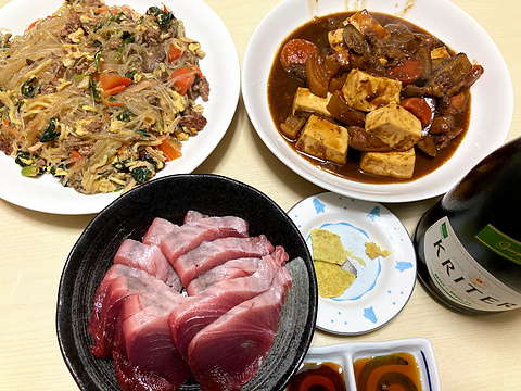 本日のメニューは、上段左から残り物チャプチェ風、豆腐と牛すじの煮込み、下段がカツオの刺身、です。