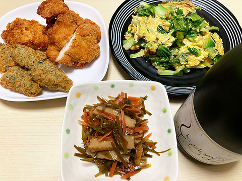 本日のメニューは、上段左からフライドチキンと海苔風味白身魚フライ(冷凍品を揚げたもの)、青梗菜の玉子炒め、下段が昆布煮、です。
