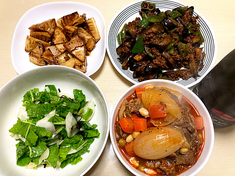本日のメニューは、上段左からタケノコのバター醤油焼き、鍋しぎ、下段左からカブの塩昆布和え、牛すじと豆のトマト煮込み、です。