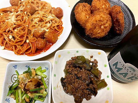 本日のメニューは、上段左からミートボールトマトパスタ、コロッケ(冷凍品を揚げたもの)、下段左からカブの塩昆布和え、鍋しぎ、です。