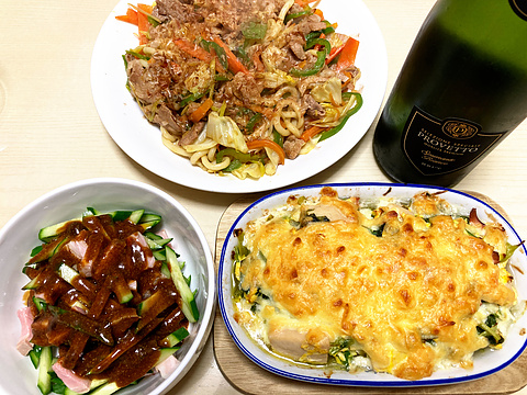 本日のメニューは、上段が焼きうどん、下段左からきゅうりと低温調理豚のごまみそ和え、高野豆腐と新玉ねぎとカブの葉の塩辛チーズ焼き、です。