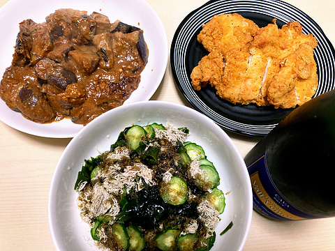 本日のメニューは、上段左からサバとナスのごまみそ煮、フライドチキン(冷凍品を焼いたもの)、下段がきゅうりとワカメの海苔とろろ昆布の酢の物、です。