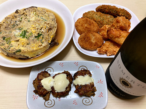 本日のメニューは、上段左からアサリの深川、揚げ物各種(冷凍品を揚げたもの)、下段がつくね団子のクリームチーズ乗せ、です。