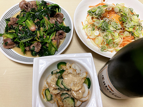本日のメニューは、上段左から砂肝とほうれん草の塩炒め、ぶっかけうどん、下段がきゅうりとちくわのサラダ、です。