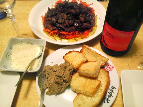 本日のメニューは、牛ハラミと鶏レバーのソテー−バルサミコソースがけ、鶏レバーのパテ、パン、です。