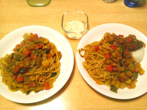 右側のお皿はピカさんがご飯も食べたいということで、カレーパスタライスになっています