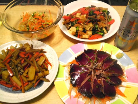 本日のメニューは、キンピラごぼう、厚揚げとターサイとにんじんのオイスターソース炒め、カツオのタタキ、中華クラゲ、です。