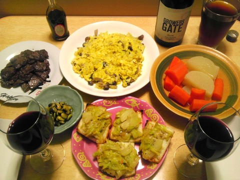 本日のメニューは、ハラミ焼き、キャベツとシメジの玉子炒め、にんじんと大根のコンソメ煮、キャベツとブルーチーズのトースト、です。