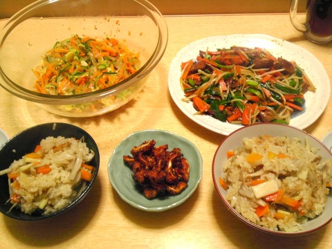 本日のメニューは、タケノコご飯、レバニラ炒め、タケノコ入り中華クラゲサラダ、豚のウチワの唐揚げ塩麹味です。