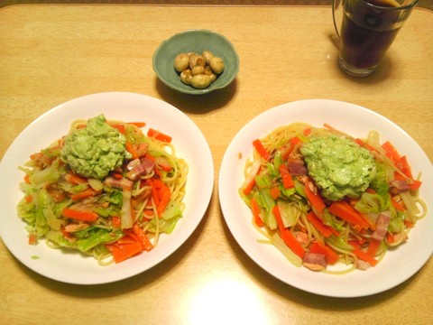 本日のメニューは、春キャベツの和風パスタ&アボカドマヨネーズ添え、マッシュルームのマリネ、です。
