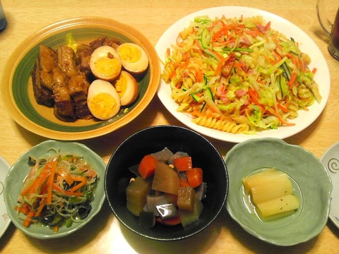 本日のメニューは、豚角煮、野菜パスタ、昨日の残り物、です。