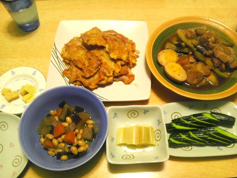 本日のメニューは、ポークピカタ、ナスと麸の煮物、キュウリのぬか漬け、長ネギのマリネ、五目豆、です。