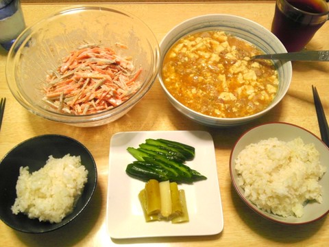 本日のメニューは、麻婆豆腐、ごぼうとにんじんのサラダ、ぬか漬け、長ネギのマリネ、です。