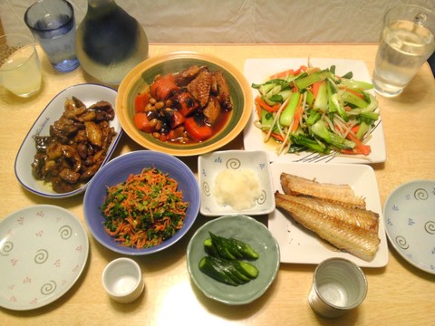 本日のメニューは、ホッケ焼き、チンゲンサイとモヤシの中華炒め、にんじんと葉っぱの胡麻和え、鶏皮とレバーのタレ焼き、ぬか漬け、手羽先と大豆の煮物、です。