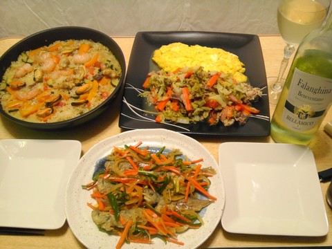 パエリア、砂肝とキャベツのマスタード煮込みチーズオムレツ添え、他
