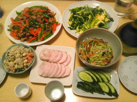 本日のメニューは、野菜たっぷり豚キムチ、ホウレン草の玉子炒め、鶏ハム、松前漬けの香味野菜和え、ぬか漬け、です。