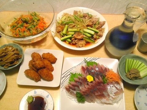 本日のメニューは、イナダの刺身、中華クラゲのサラダ、鶏肉とモヤシとキュウリのラー油炒め、カキフライ、メンマ、カニ味噌、です。
