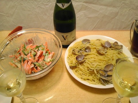 本日のメニューは、右がボンゴレビアンコ、左がにんじんとキュウリのツナサラダ、です。