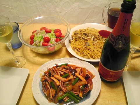 本日のメニューは、左上がキャベツと豚肉の粒マスタードサラダ、右上が和風キノコパスタ、下のお皿がイカのトマトソース煮、です。