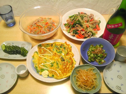 本日のメニューは、左上が春雨サラダのマグロカマ入り、右上がコブクロ炒め、中央がニラ玉、中央右がオクラのしょうが漬け和え、右下がモヤシのナムル、左端のお皿がキュウリのぬか漬け、です。