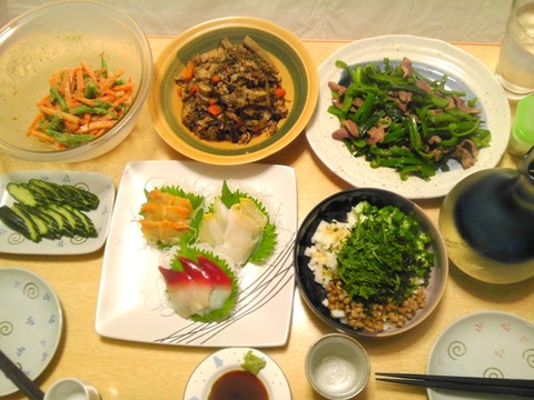 「貝の刺身、ゴボウとにんじんの炒り煮、ネバネバ3色和え、他」への1件のフィードバック