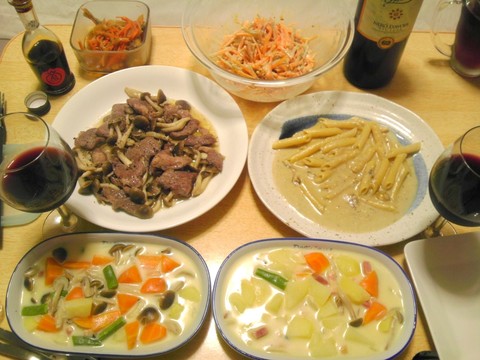 本日のメニューは、上段左からアジの南蛮漬け、にんじんとゴボウのゴマサラダ、中段左から羊肉のシメジ焼き、ブルーチーズペンネ、下段はクラムチャウダー、です。